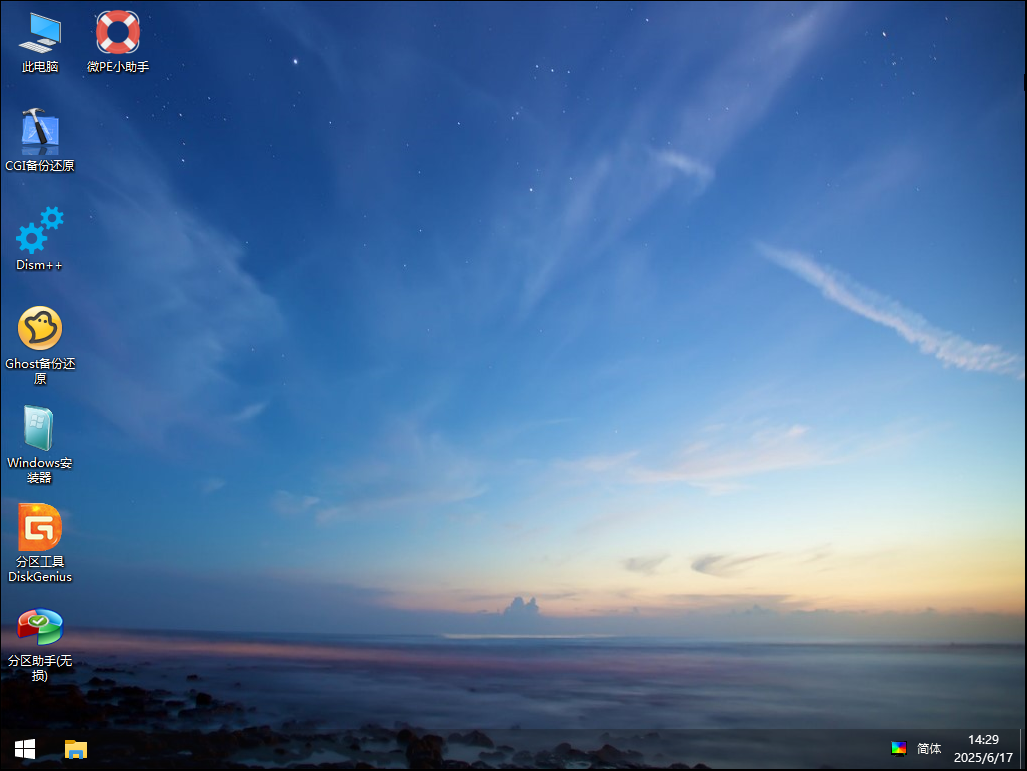 成功进入微PE系统桌面后,如果你的硬盘是全新的需要分区,可以使用桌面上的“DiskGenius”分区工具进行“快速分区”(注意勾选“对齐分区到4096扇区”以优化固态硬盘性能)。如果你的电脑已经分好区了,请直接看下面的系统还原步骤:
